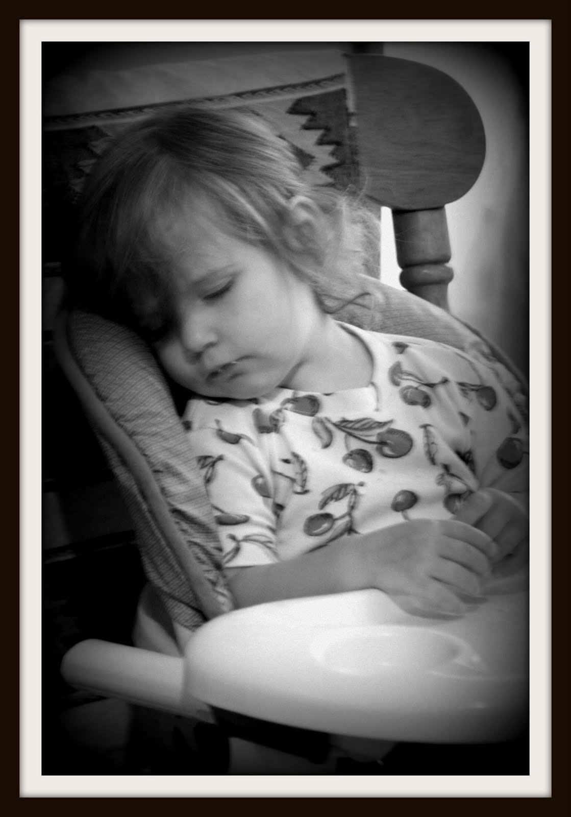 She fell asleep in her high chair at noon as she was nibbling on the cracker.